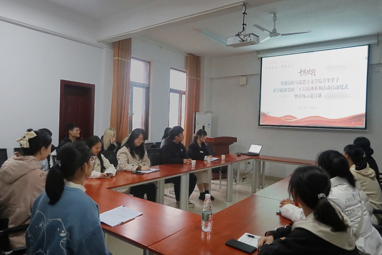 为深入学习贯彻党的二十大精神,进一步体会感悟习近平新时代中国特色社会主义思想,由教育部社科司指导,清华大学永利yl23411发起,37家全国重点永利yl23411联合主办的“千马廿行”全国高校永利yl23411青年学子联学联讲党的二十大精神系列活动在清华大学正式启动。马院作为承办单位之一,积极组织学院“薪火湘传”宣讲团的代表成员们于11月18日在立言楼A630共同观看了“千马廿行”启动仪式暨首场示范宣讲线上直播。