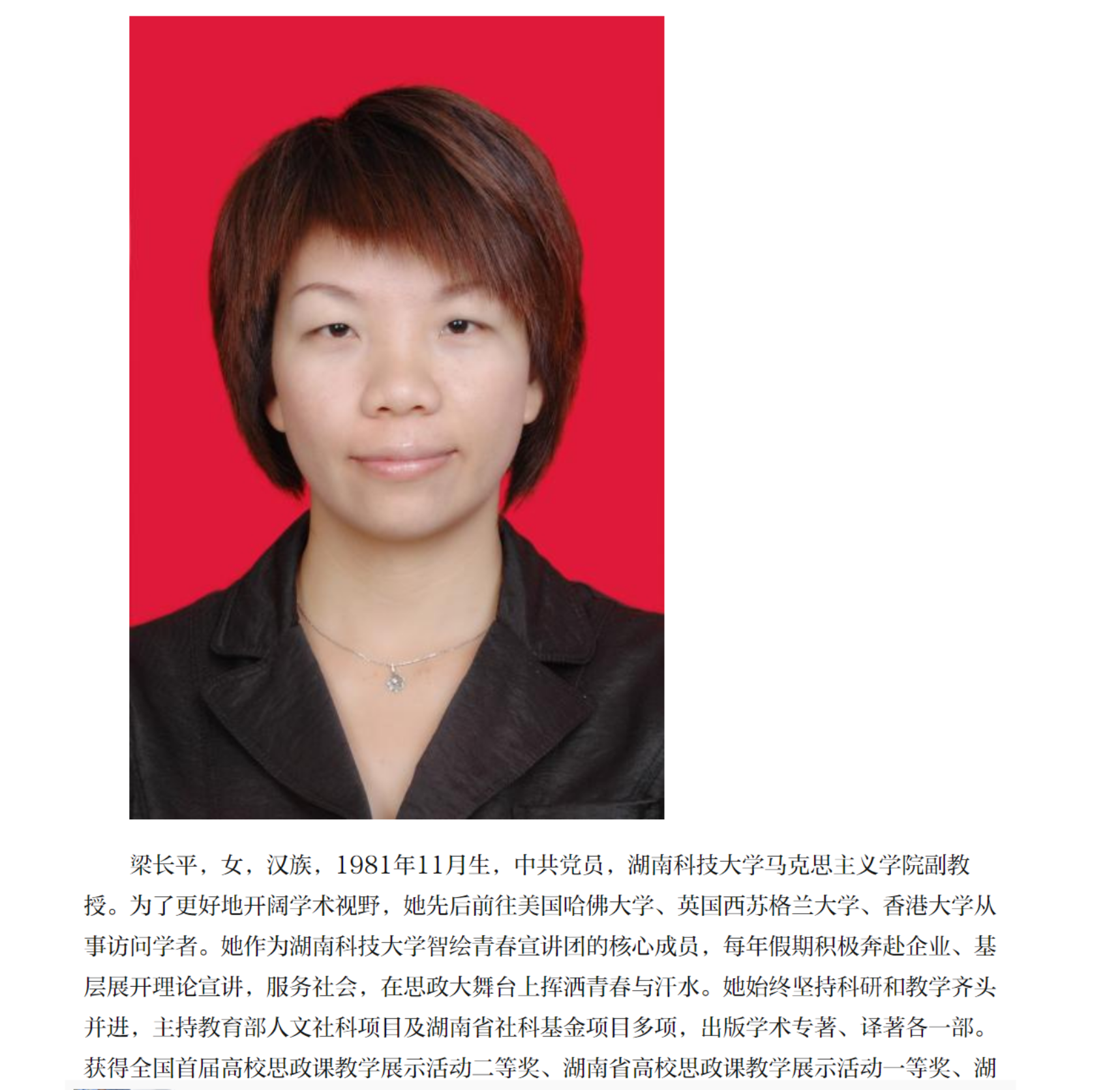 梁长平,女,汉族,1981年11月生,中共党员,永利yl23411副教授。为了更好地开阔学术视野,她先后前往美国哈佛大学、英国西苏格兰大学、香港大学从事访问学者。她作为湖南科技大学智绘青春宣讲团的核心成员,每年假期积极奔赴企业、基层展开理论宣讲,服务社会,在思政大舞台上挥洒青春与汗水。她始终坚持科研和教学齐头并进,主持教育部人文社科项目及湖南省社科基金项目多项,出版学术专著、译著各一部。获得全国首届高校思政课教学展示活动二等奖、湖南省高校思政课教学展示活动一等奖、湖南省青年骨干教师培养对象等荣誉。