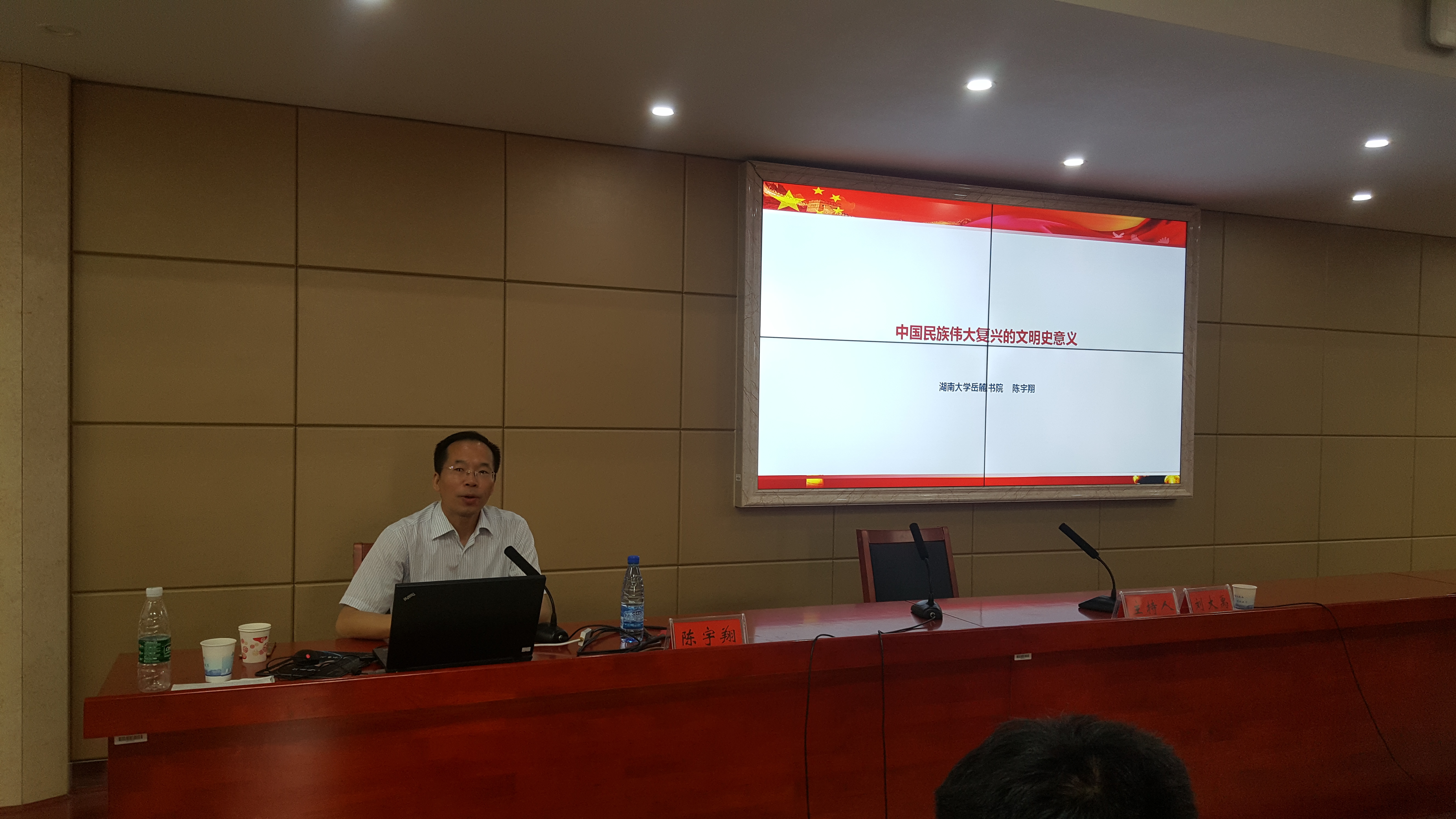 8月4日上午,湖南大学岳麓书院党委书记陈宇翔教授为2018年湖南省“习近平新时代中国特色社会主义思想研读”暑期学校作第十四次学术报告,报告主题为“中华民族伟大复兴的文明史意义”。报告由我院副院长刘大禹主持。