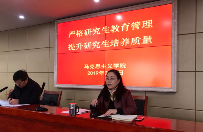 会议最后,廖书记做总结发言。她对学院各学位点、研究生导师、研究生管理人员和研究生分别提出了希望和要求:一是要求各学位点严格抓好研究生培养环节,重点抓住并做好课程教学、论文开题、中期考核、评阅、答辩、学位评定等关键环节,严格执行学位授予全方位、全流程管理;二是要求研究生导师自觉落实立德树人职责,做好研究生的学术训导人和人生引路人;三是要求研究生管理人员强化服务意识,不得违规向研究生收取任何不合理、不正当的经费,也不得违规向学位点索取服务报酬;四是要求研究生谨遵学术规范,恪守学术道德,谨防学术失范和学术腐败行为的发生,不断增强自身学术创新能力和实践创新能力。