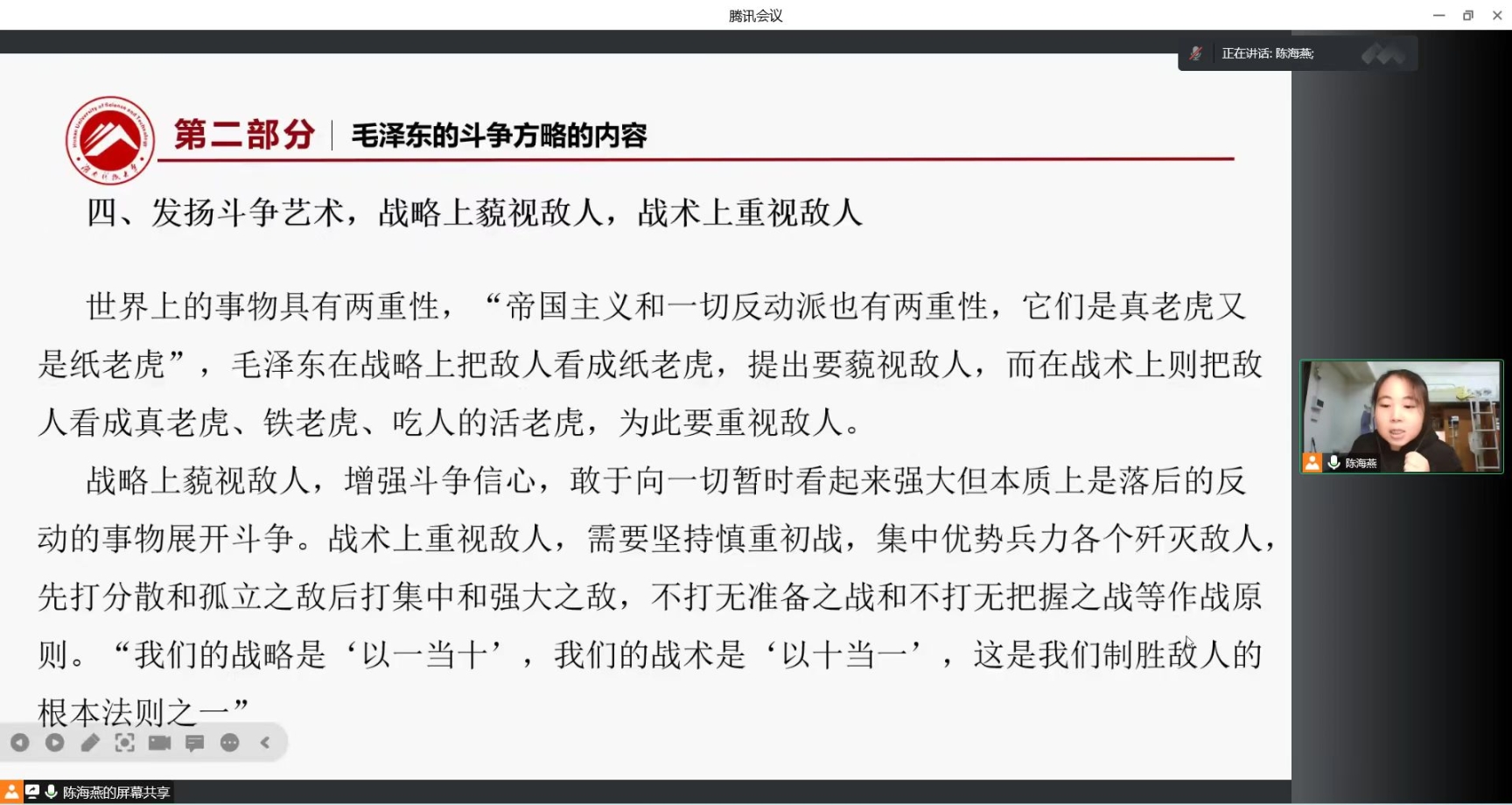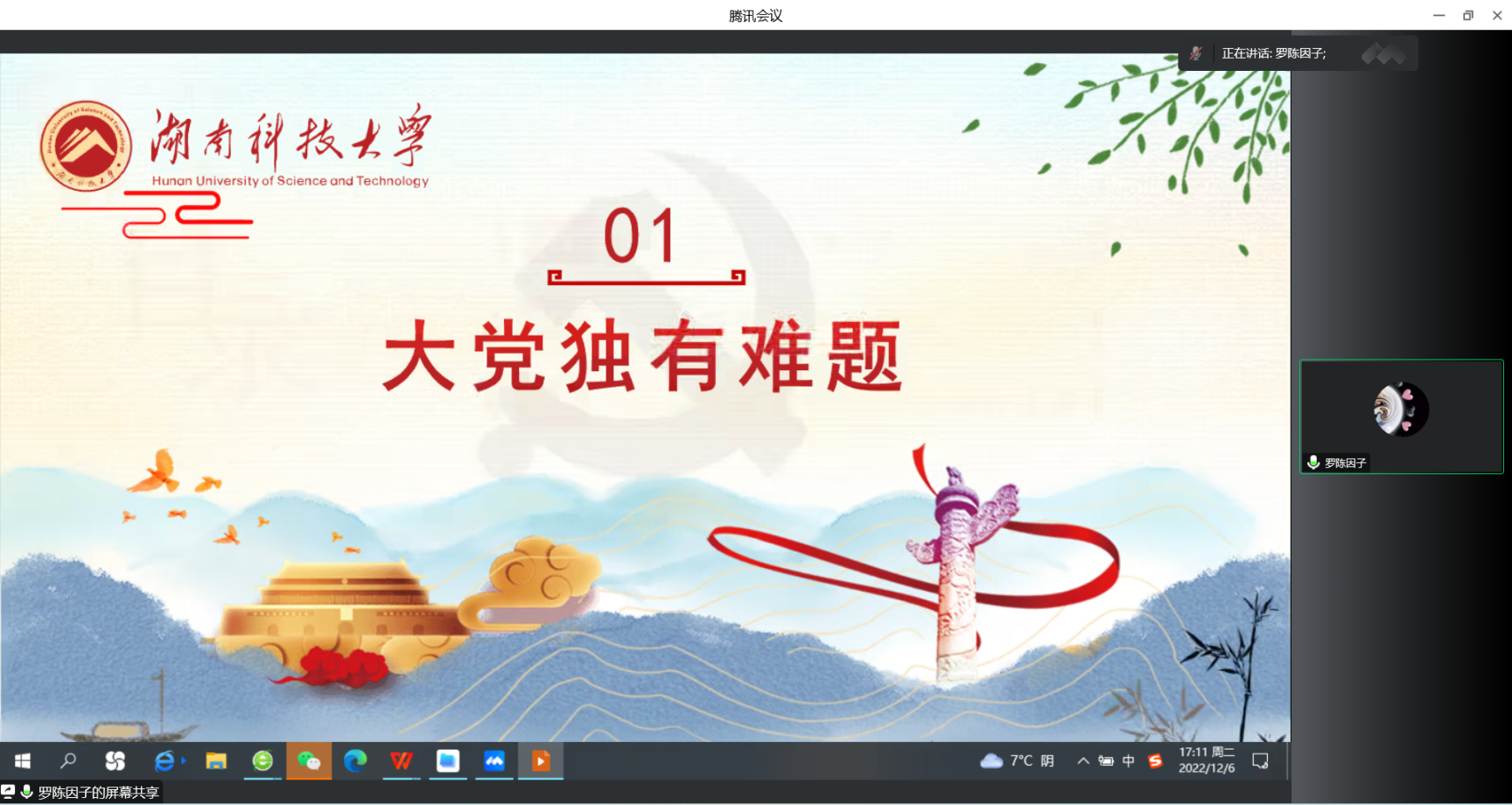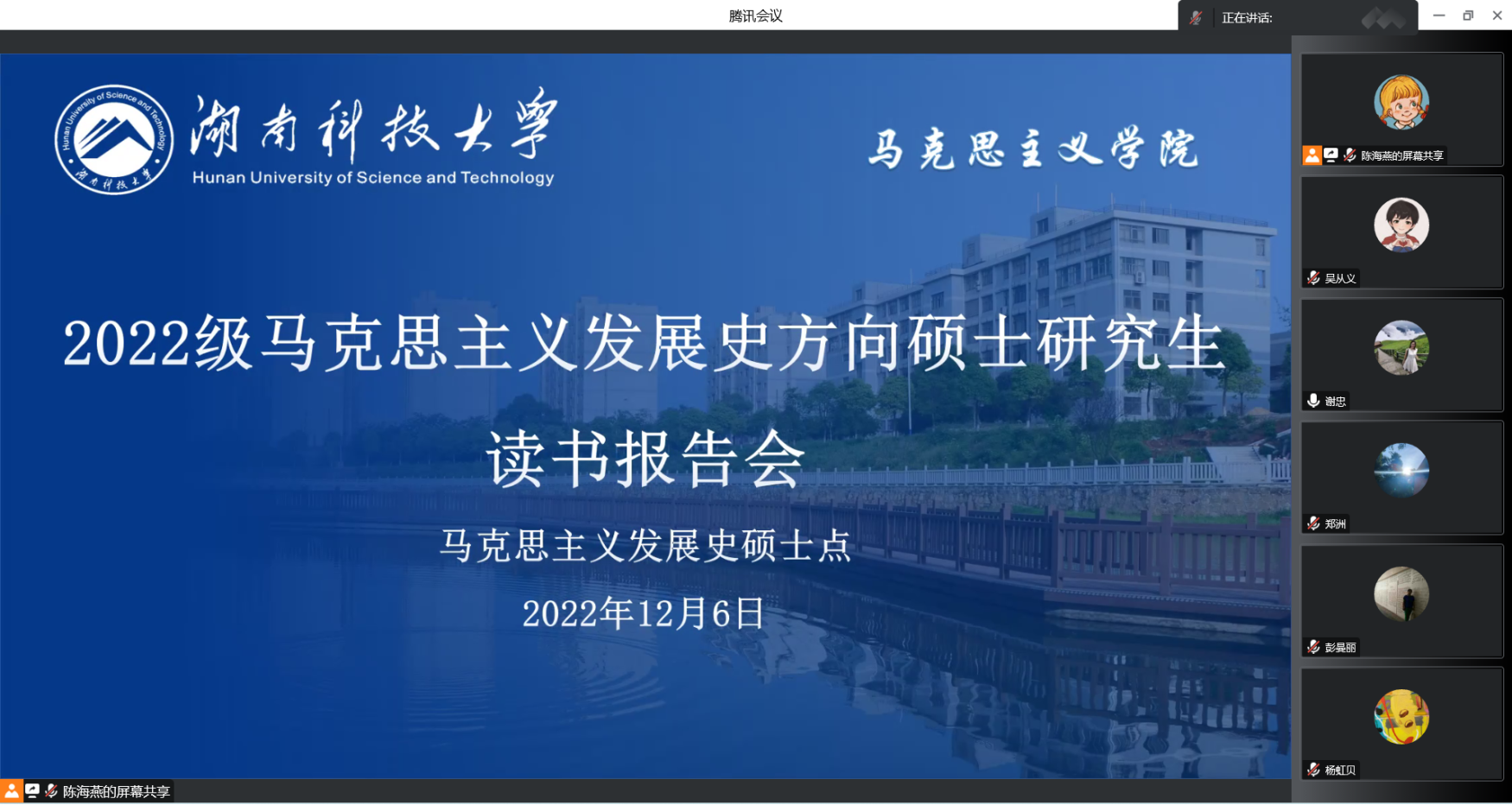 为深入学习研究党的二十大精神,2022年12月6日,我院22级马克思主义发展史方向在线上举行了主题为“深入学习党的二十大报告”的读书报告会。报告会由谢忠老师主持,韩平老师、戴开尧老师、彭曼丽老师、周建华老师莅临指导,2022级马克思主义发展史方向全体硕士生参加。