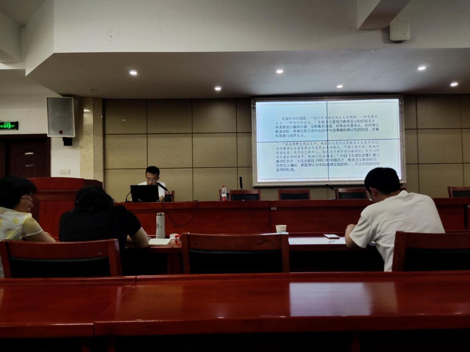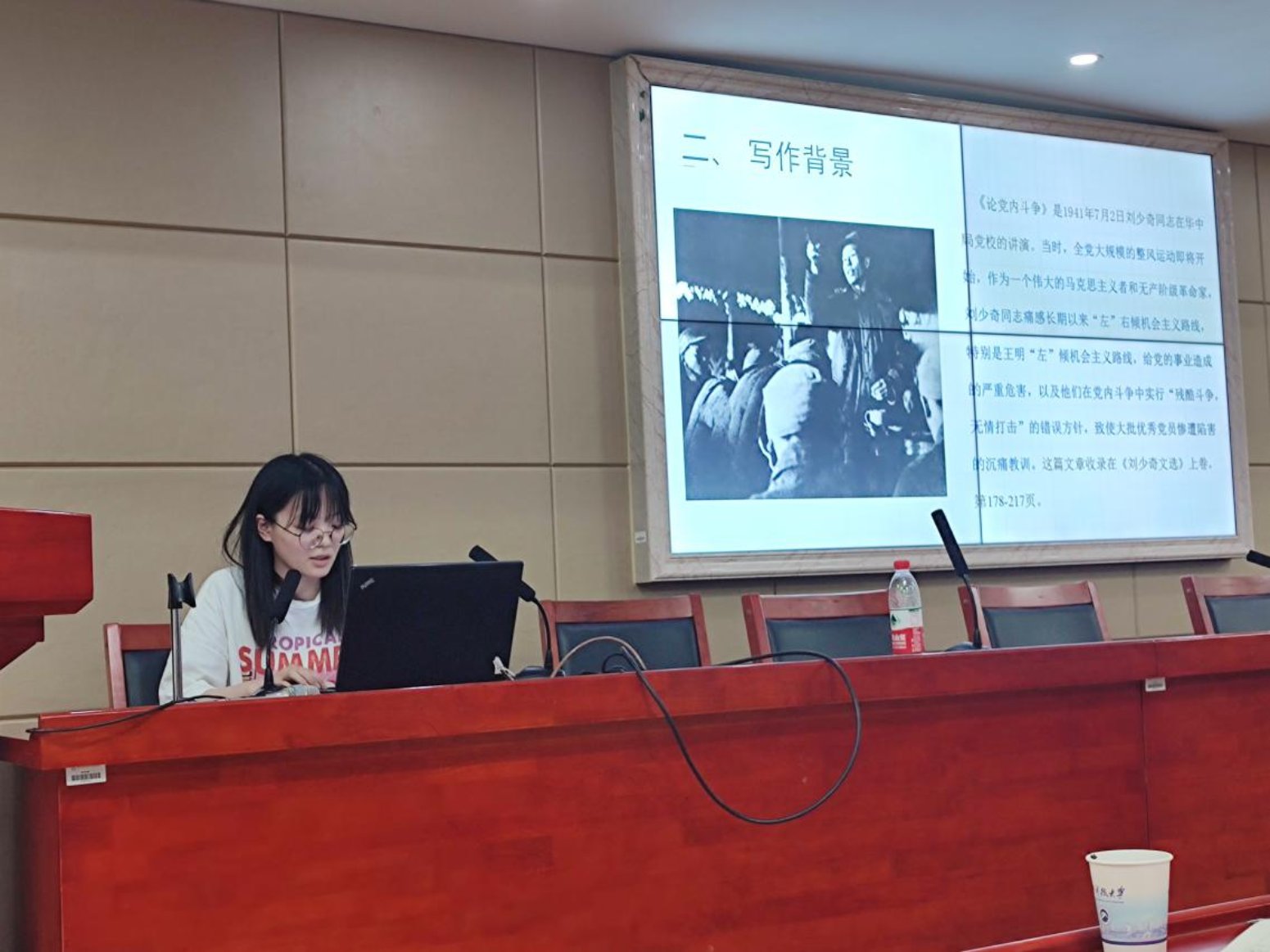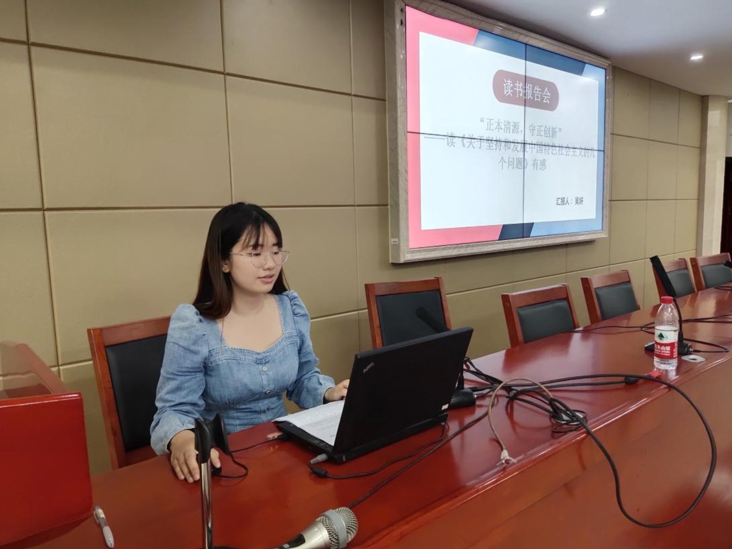 本场读书报告会共有三位同学汇报。第一位进行读书汇报的是吴妍同学,她汇报的题目是“正本清源,守正创新”——读《关于坚持和发展中国特色社会主义的几个问题》有感,从文章的时代背景、主要内容、重大意义和对当今党史学习教育的思考出发,谈论了中国特色社会主义是科学社会主义理论逻辑和中国社会发展历史逻辑的辩证统一、正确认识改革开放前后两个历史时期的关系、发展马克思主义是共产党人的神圣职责和重要使命和新时代党员干部要坚定共产主义的远大理想这四大内容,并在最后谈论理论与实践意义。第二位进行读书汇报的是姬晓凯同学,他的报告题目是整顿党的作风加强党的建设——学习毛泽东同志《整顿党的作风》的体会,首先从党内情况和党所处的环境来介绍文章的写作背景,进而介绍《整顿党的作风》的主要内容,最后谈论该文章的写作意义以及个人体会。第三位同学进行读书汇报的是杜晨营同学,她给大家分享的文章是刘少奇的《论党内斗争》,该文章论述了党内斗争的必然性和必要性,分析了中国共产党产生的特殊历史条件,为纠正过去中共党内“左”倾错误提出了原则性的意见,这对我们今天进一步加强党风建设及推动党的民主化进程具有重大的现实意义。