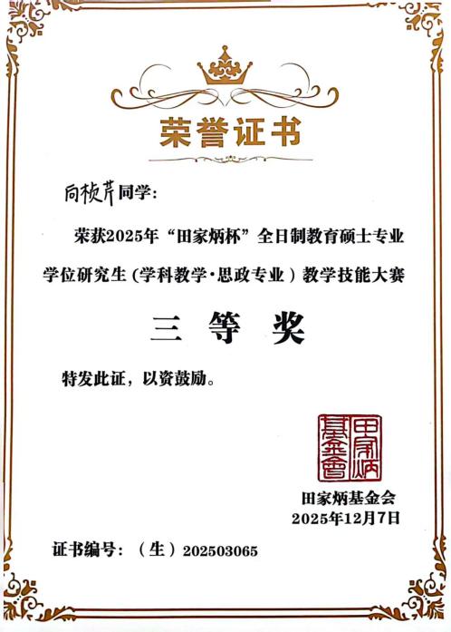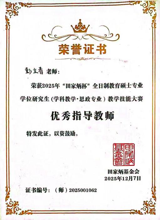 12月5日至7日,2025年全国“田家炳杯”全日制教育硕士专业学位研究生(学科教学·思政)教学技能大赛在江西师范大学圆满落幕。经过激烈角逐,我校永利yl234112023级学科教学(思政)专业硕士研究生刘超群荣获“二等奖”,向桢芹、王迁荣获“三等奖”;彭立春老师荣获“优秀指导教师奖”。