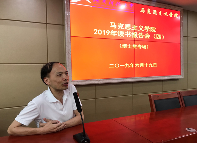 点评老师对博士生专场读书报告会提出了更高的要求。朱春晖教授首先对读书报告会作了明确要求,指出同学们对待读书报告会的态度必须端正、认真准备、力求深刻,要读经典、读原著、读学术前沿著作,他肯定了何殿较好把握了著作的理论渊源,但同时也指出了何殿同学准备不充分、讲述吸引力不强的问题。罗建文教授认为,马克思主义理论专业的研究生必须对马克思主义的起源、产生和发展有深入了解,必须读经典、读原著,打好专业基础,要提高读书水平和读书质量,诵读经典、引用经典、理解原文。廖和平教授肯定了王维琳同学认真的学习态度,也指出了她所存在的相关理论介绍缺乏连贯性和系统性、读后思考缺乏逻辑性、语言表达缺乏磁性等方面的不足,同时希望研究生“读书要勤、读书要选、读书要活”。