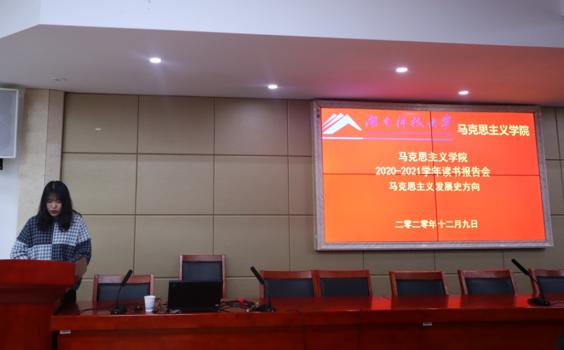 报告会上,赵志颖、张小梅和钟樱支三位同学同台汇报。第一位分享读书心得的是赵志颖同学,她从写作背景及缘由、主要内容和观点、理论价值与现实意义以及个人阅读感悟四个方面向大家介绍了《家庭、私有制和国家的起源》一书。她指出本书是恩格斯运用唯物史观研究国家的重要成果,它科学地阐明了家庭、私有制、阶级的起源与国家产生的关系,这极大地丰富了马克思主义的政治学说。然后,张小梅同学从文章写作的历史背景、主要内容、当代价值和个人收获四个方面与大家交流学习了《新时代马克思主义必修课》一书。此书主要是对马克思主义基本原理的内容和马克思主义与中国的具体实际相结合的一些问题进行阐述,以帮助马克思主义理论工作者和学习者更加清楚地了解马克思主义,了解马克思主义在中国的发展过程中所起到的指导性作用,并且强调了当代马克思主义理论工作者要促进马克思主义在中国的发展和创新。最后与大家分享读书心得的是钟樱支同学,她阅读的书目是《社会主义从空想到科学的发展》。她从写作背景、主要内容和当代价值及其启示三个方面向大家作出了报告。她指出该书是一部阐述科学社会主义的思想来源、理论基础和基本原理的重要著作,书中说明了空想社会主义是科学社会主义的直接思想来源,唯物史观和剩余价值学说两大理论发现使社会主义从空想变成了科学,资本主义基本矛盾的发展导致社会主义的必然出现等重要理论观点。