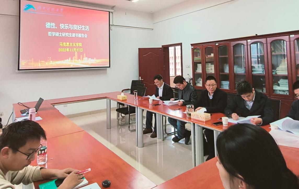 “良好生活”是哲学思考亘古不变的主题之一,苏格拉底就曾提出:“未经反思的生活是不值得过的。”为更好定义“良好生活”以及思考“良好生活”对个体与世界的意义,我院哲学硕士点2022年11月27日下午,在立言楼A630举办了以“德性、快乐与良好生活”为主题的读书报告会。此次报告会由颜中军教授主持,特邀嘉宾张晚林教授、汪隐峰博士、温航亮博士、龚超博士点评,全体哲学研究生共同参与学习。