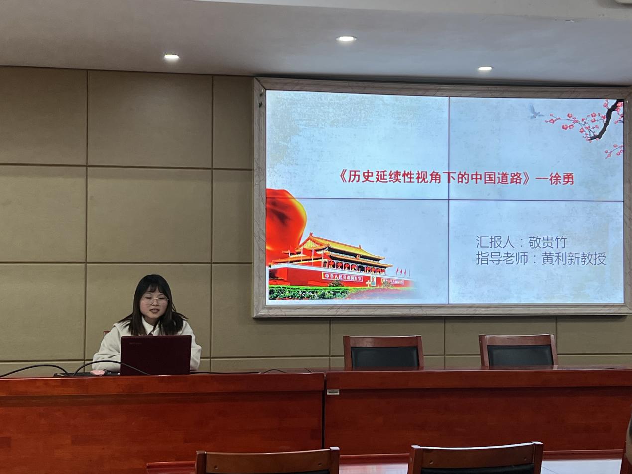 此次读书报告会共有四位同学参与汇报。敬贵竹同学分享了阅读《历史延续性视角下的中国道路》一文的所思所感,她指出,该文章用历史比较的分析方法论证了中国特色社会主义道路的历史延续性及其内在动力与惰性缺陷。最后敬贵竹提出了应如何读书的几点思考。舒隽同学从框架逻辑、内容特点与成书的时代背景和实践基础等方面对《习近平谈治国理政》第三卷 进行深刻解读,并结合当下的热点问题提出了现实思考。樊婧同学分享的是《中国共产党的历史使命与行动价值》,这篇文章为我们全方位、多角度、立体化地展示了中国共产党的基本特征,深刻揭示了中国共产党为什么“能”的深层逻辑,最后樊婧同学结合“七一讲话”精神对党的百年奋斗历程做了更深入的理论剖析。赵杨同学就毛泽东的《论新阶段》一书分享了自己的心得感悟,她认为当时的“新阶段”是抗日战争和抗日民族统一战线的新阶段,同时结合中国化的历史进程对该书的当代价值进行了理论探索。