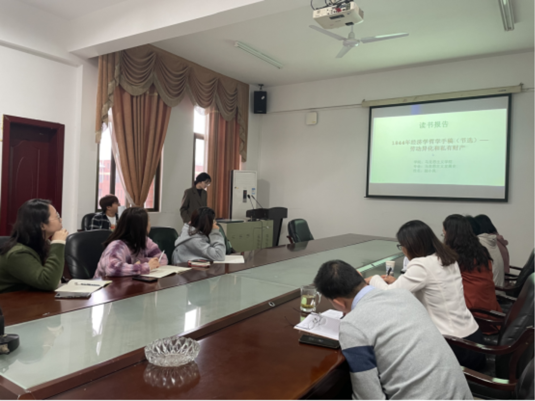 此次读书报告会共有三位同学做汇报。全林峰同学就《雇佣劳动与资本》一书,从写作背景与目的、导言和主要内容、“资产者”与“资本家”、资本主义制度下的分工与劳动退化四个方面分享了学习体会。他从不同角度论证了马克思将“资产者”改为“资本家”的原因,就资本主义制度下的分工与劳动退化的问题提出了自己的思考和观点。谭琪同学从写作背景、主要内容、历史地位和时代价值四个方面解读了《人民民主专政》。她提到:“该著作创造性地运用和发展了马列主义关于无产阶级专政的理论、为新时代中国中国特色社会主义民主政治建设提供思想源泉与理论根基、为实现新中国梦提供了根本政治保证和制度基础”,并针对“在世界战略态势下,如何坚持人民民主专政”提出了思考。赵小凤同学从《1844年经济学哲学手稿(节选)——劳动异化和私有财产》的写作背景、劳动异化理论、疑惑和感想三个方面作了汇报。她分析了异化劳动的四个特征,即工人与劳动产品、工人与劳动过程、工人与人的类本质、人与人相异化,并对“人的本质是什么”进行了解读。
