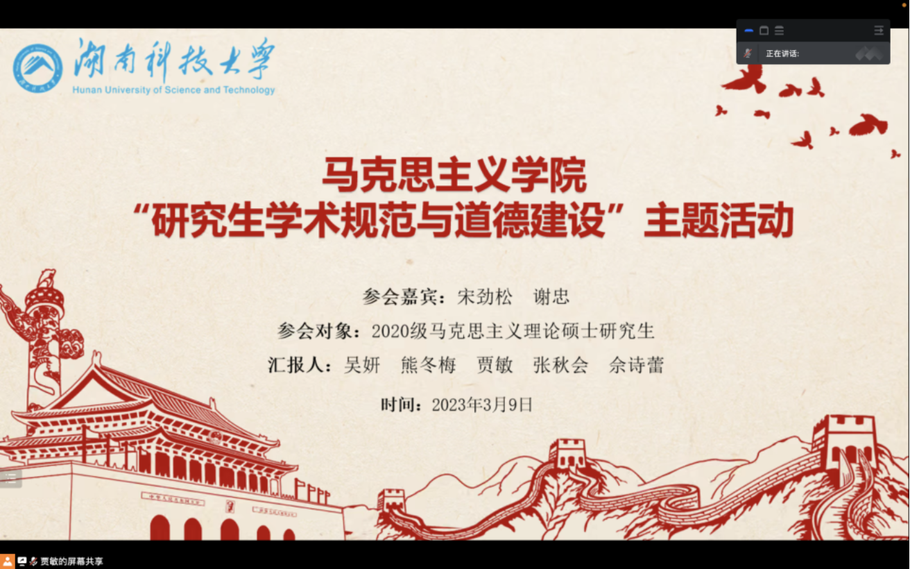 20级马理论专业5个方向的学生代表进行了汇报分享。马克思主义中国化方向吴妍同学从学位论文常见不端问题、理性看待信息化工具两个方面解析学术不端行为。马克思主义基本原理方向熊冬梅同学以“研究生学术规范与道德建设”为题,通过大量学术不端案例作为警示镜鉴,呼吁大家坚守学术诚信,恪守学术道德。思想政治教育方向佘诗蕾同学从学术不端行为定义、学术不端的影响、避免学术不端的实践路径三方面,强调弘扬学术诚信。中国近现代史基本问题研究方向贾敏同学结合学术不端的实际案例,阐述了学术不端的定义、表现形式和处罚。马克思主义发展史方向张秋会同学解读了当代高校研究生学术道德现状与加强研究生学术道德建设的对策与建议。