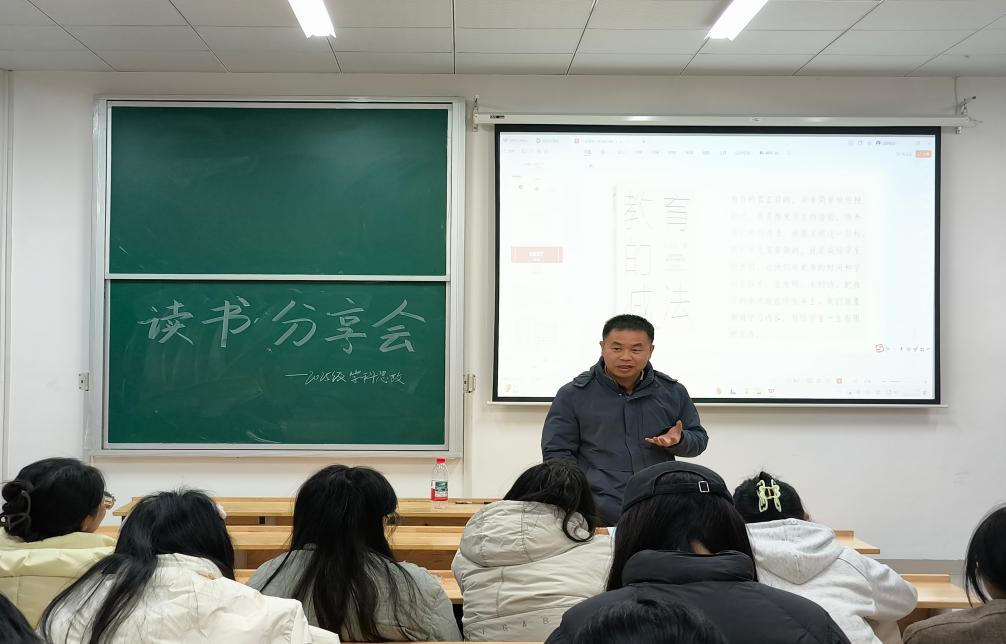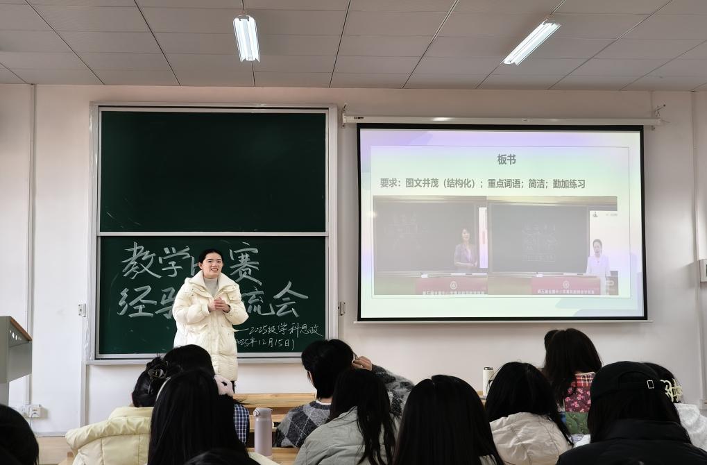 2025年12月15日下午,我院2025级学科教学(思政)专业教学比赛经验交流会暨读书分享会于雨湖校区2教301教室举行。此次活动由李熠琳同学主持,彭立春、丁桂馨老师莅临指导,2025级学科教学(思政)专业全体研究生参会。活动特邀2023级研究生向桢芹、王迁分享教学比赛经验,2025级研究生陈琳、熊诗琪等十一位同学分享了各自的读书体会。