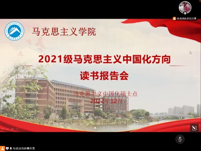 为深入学习研究党的二十大精神和《习近平谈治国理政》第四卷,2022年12月20日,我院马克思主义中国化方向举行了线上读书报告会。此次报告会由杨松菊老师主持,曾祥炎老师、唐小芹老师、梁长平老师莅临指导,马克思主义中国化方向全体硕士研究生参加。